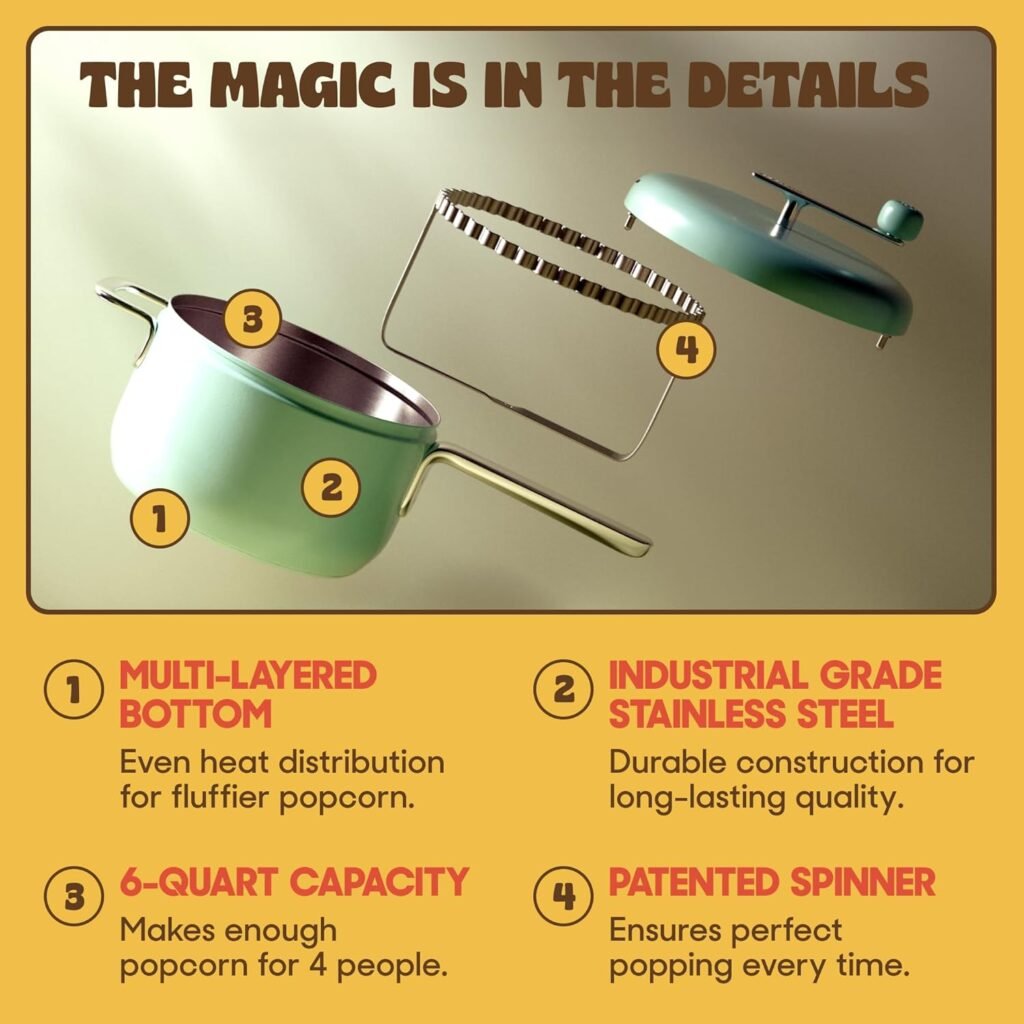 - PREMIUM PERFORMANCE – Our stainless steel popcorn popper with a multi-layered metal bottom ensures fast, even heat distr…