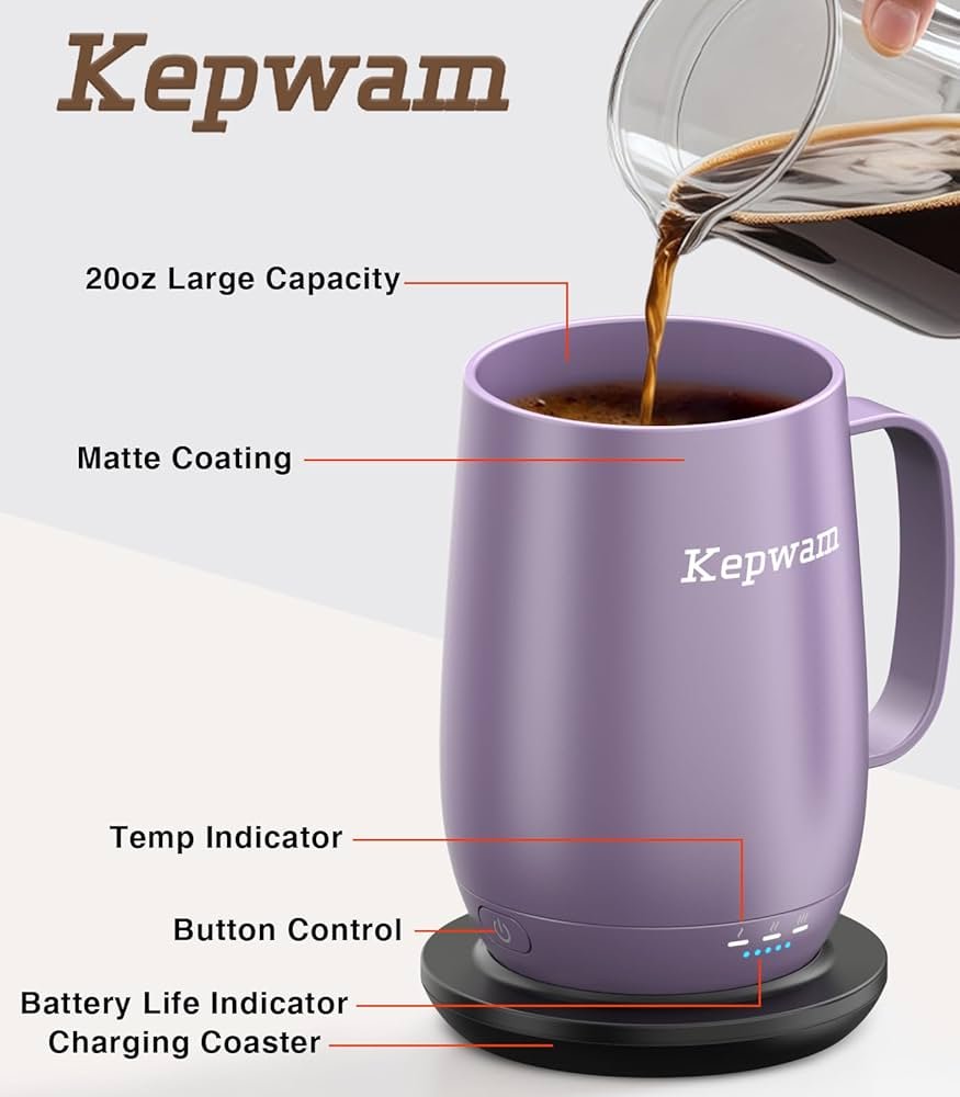 The Kepwam Self Heating Coffee Mug T2 brings top-tier functionality at a great value. With three temperature settings — warm, hot, and piping hot — and a long-lasting battery that can maintain warmth for hours, this mug makes every sip enjoyable no matter how slow your pace.