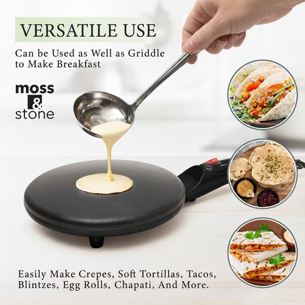 ![]() | Moss & Stone Electric Crepe Maker | • 8″ nonstick cooking surface • Automatic temperature control • Compact, easy storage • Includes dipping plate | View on Amazon |