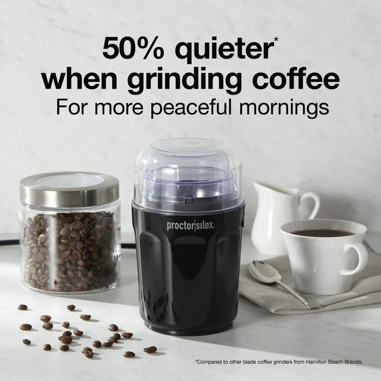 The Proctor Silex Electric Coffee Grinder with Sound Shield technology is a user-friendly grinder designed for everyday home use. Its key feature is quieter grinding thanks to the built-in Sound Shield, making it a good choice if you want to avoid loud motor noise in the kitchen.
